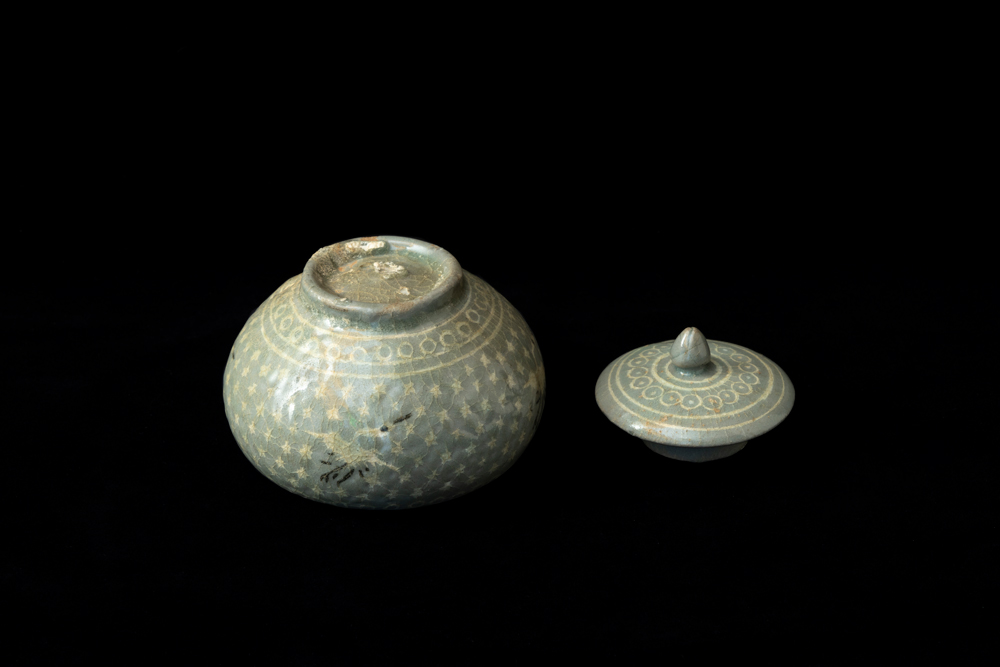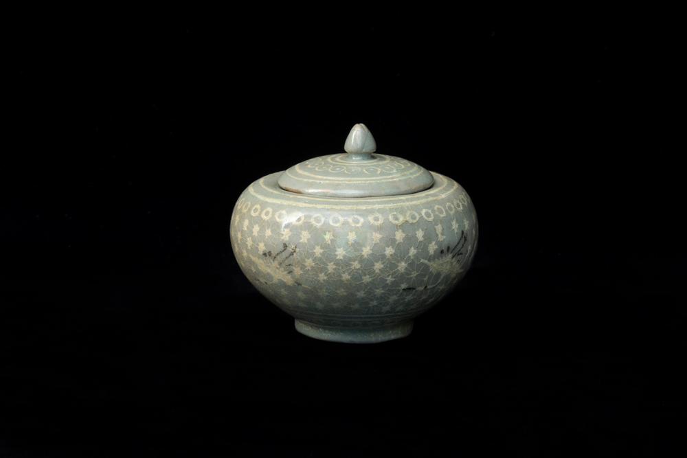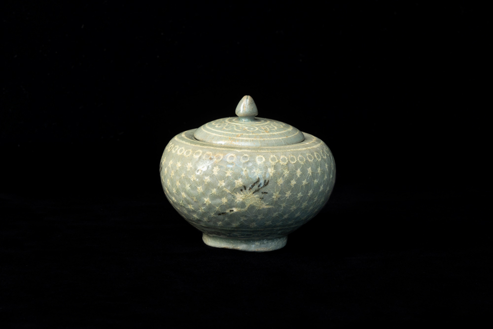 高麗青磁 象嵌雲鶴文共蓋小壷